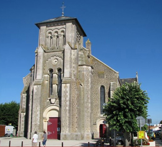 Le premier coup de pioche pour les fondations a été donné le 11 juillet 1906. Trois mois plus tard - le 10 octobre 1906, les fondations sont achevées et c'est la bénédiction de la première pierre. Au mois de juillet de l'année suivante, on commence à poser la charpente et à la fin d'août 1907, l'église est couverte. Par suite de plusieurs mois d'interruption, il a fallu attendre deux ans pour la finition du chantier. La bénédiction de l'église a lieu le mardi 17 mai, mardi de la Pentecôte. Malgré le marché de Challans, la foule nombreuse était au rendez-vous. L'église est revêtue de ses plus beaux atours, comme une mariée. Voilà ce qui était prévu: "L'intérieur de l'église aura changé d'aspect. Elle sera ornée des riches bannières et des superbes guirlandes dont le travail délicat n'a pas demandé moins de 5 à 600 journées d'ouvrières." (bulletin paroissial de 1910).