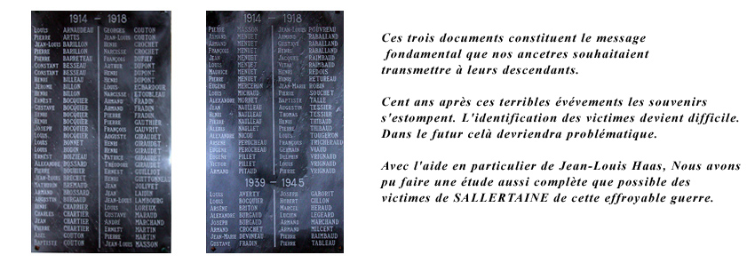 L'ensemble des informations de ces trois documents ont été réunies dans un seul tableau qui permet d'identifier rigoureusement les victimes de la "Grande Guerre". Il s'agit de la liste retenue à l'époque et qui mérite d'être respectée dans son intégralité. On y dénombre 104 noms, et il a été possible d'établir que parmi ces personnes, 19 sont nées en dehors de la commune de Sallertaine.