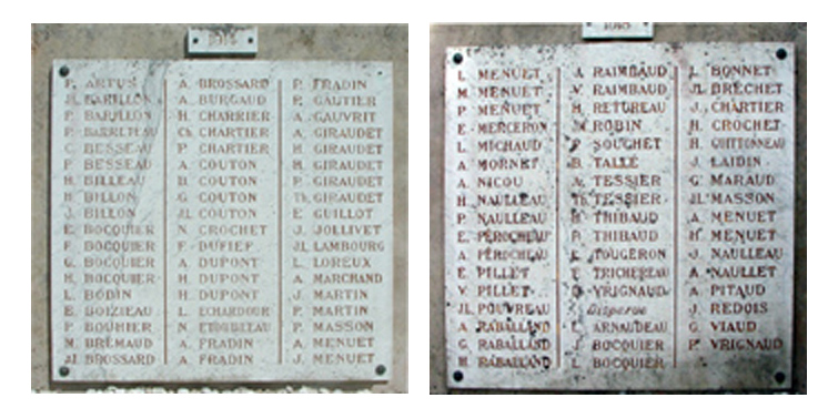 Voici d'abord le "Monument Aux Morts" composé de deux plaques de marbre blanc dans lequel on a gravé 103 noms. Vous pouvez observer que l'on y a gravé le nom de famille et seulement la première lettre du prénom.